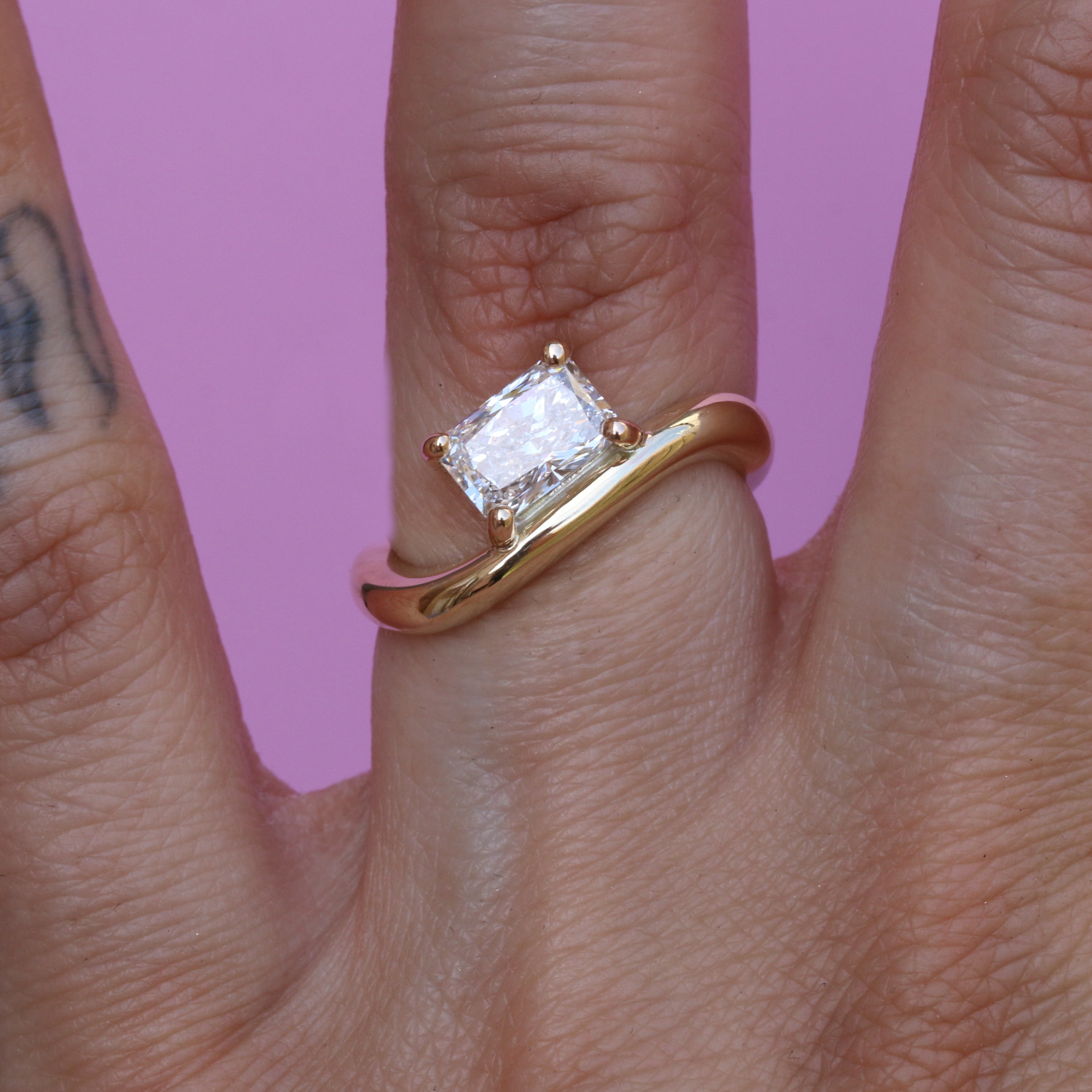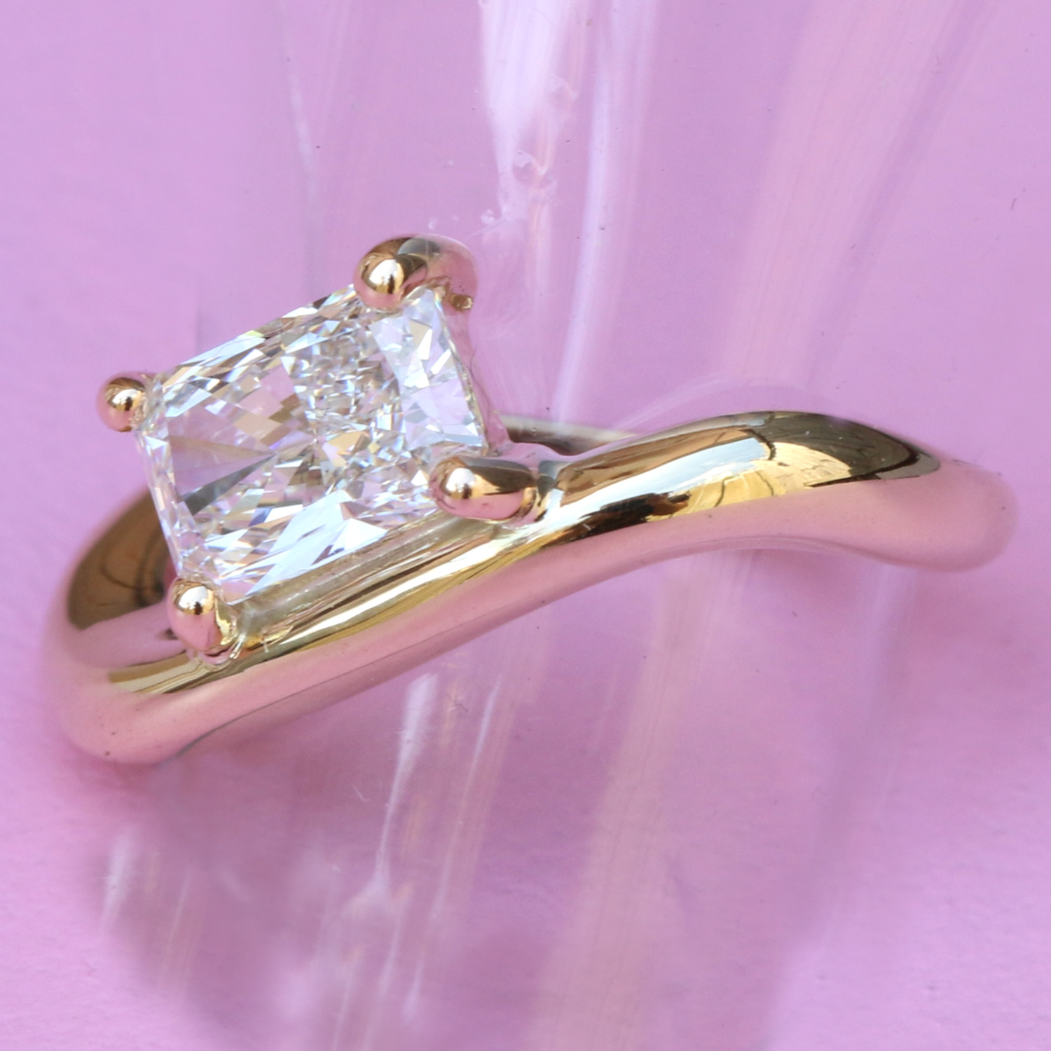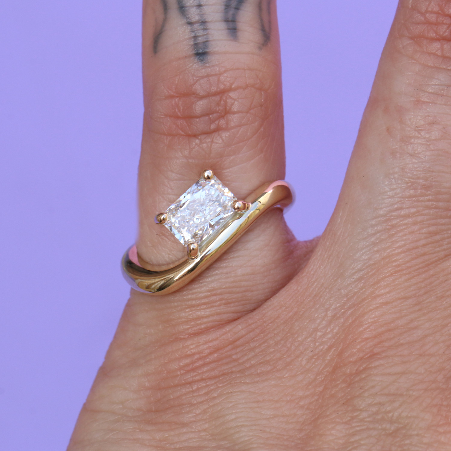 The Diamond Flow Ring is a sparkly sensation. Handmade in 9ct or 18ct yellow gold the flow ring is made to sit on a slight diagonal with a focus on shape and form. This polished goddess of a ring features a 1.25ct, colour D, clarity VS1, lab grown diamond and will come with an IGI certificate.