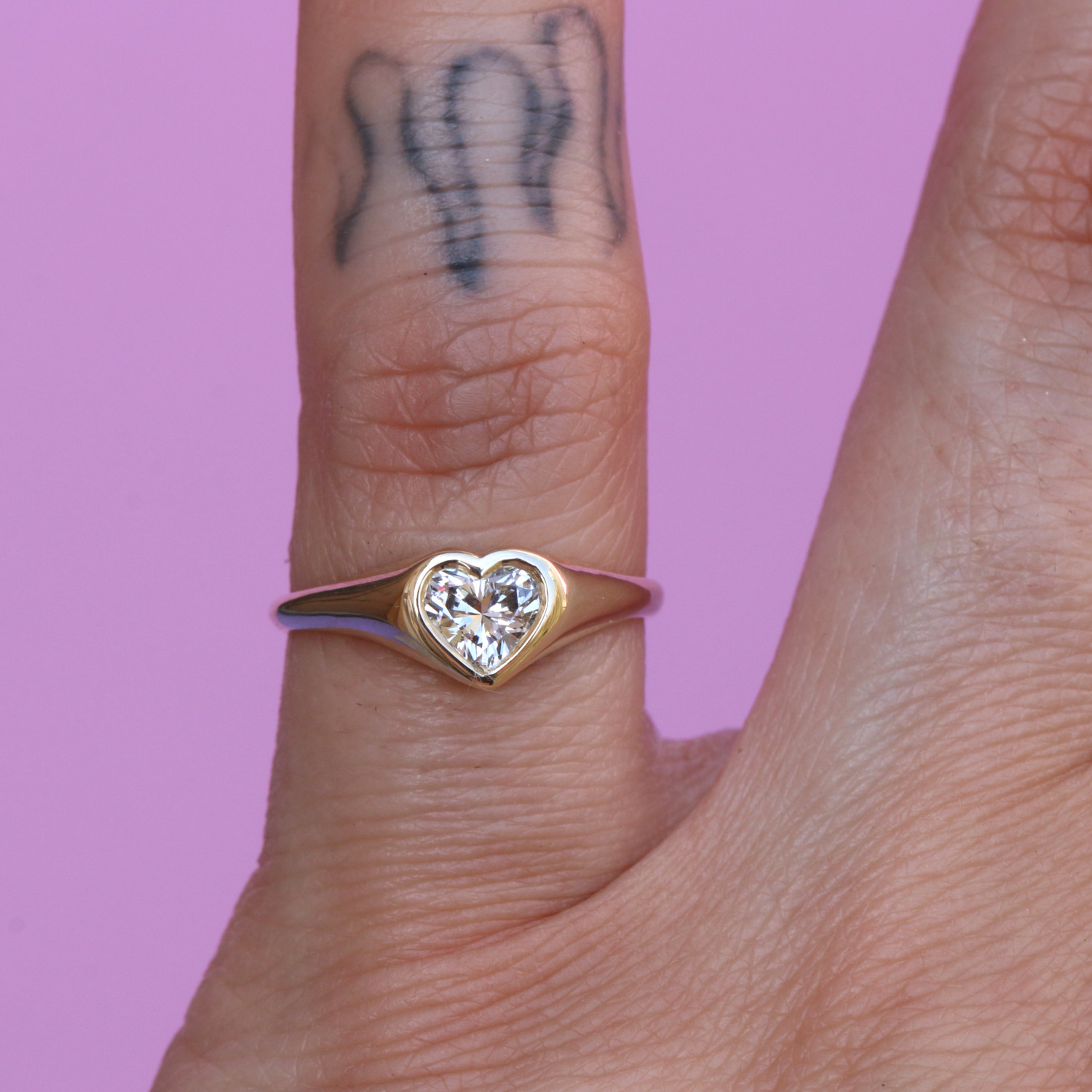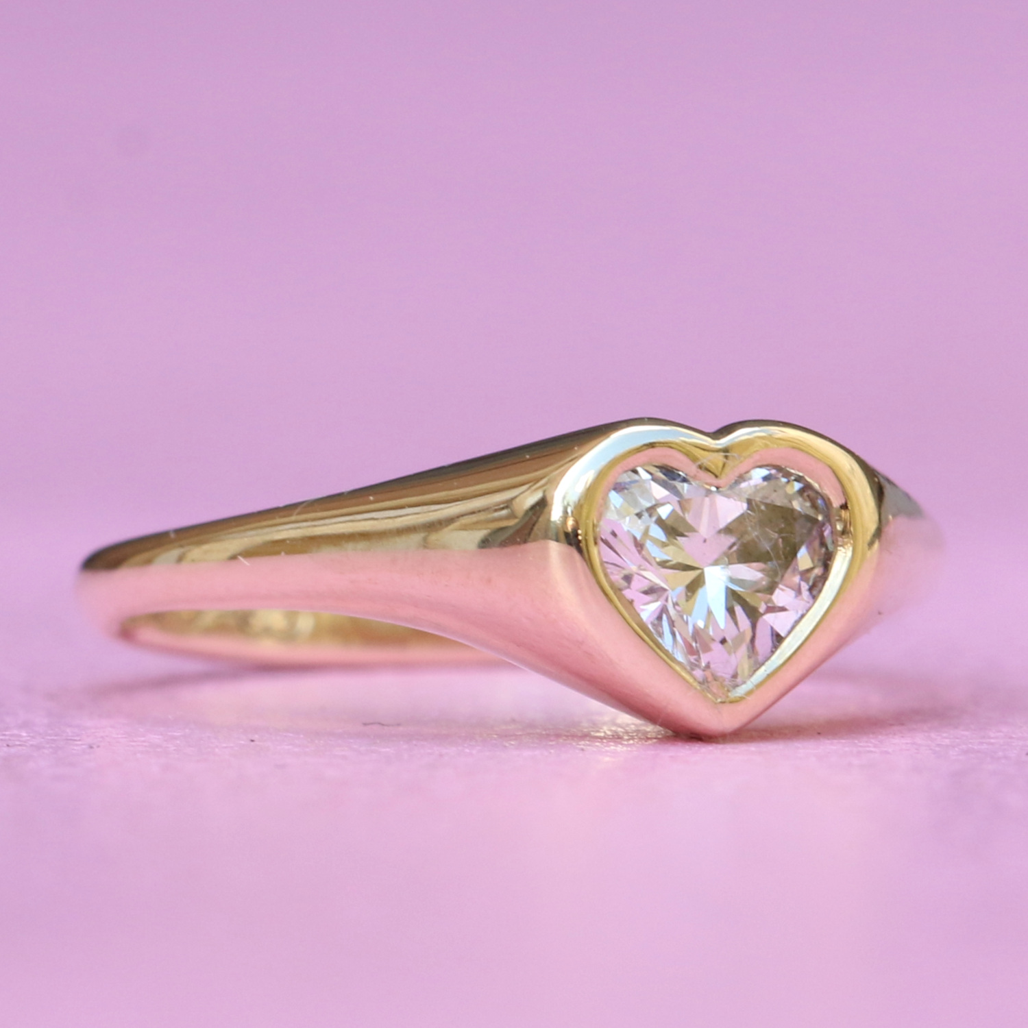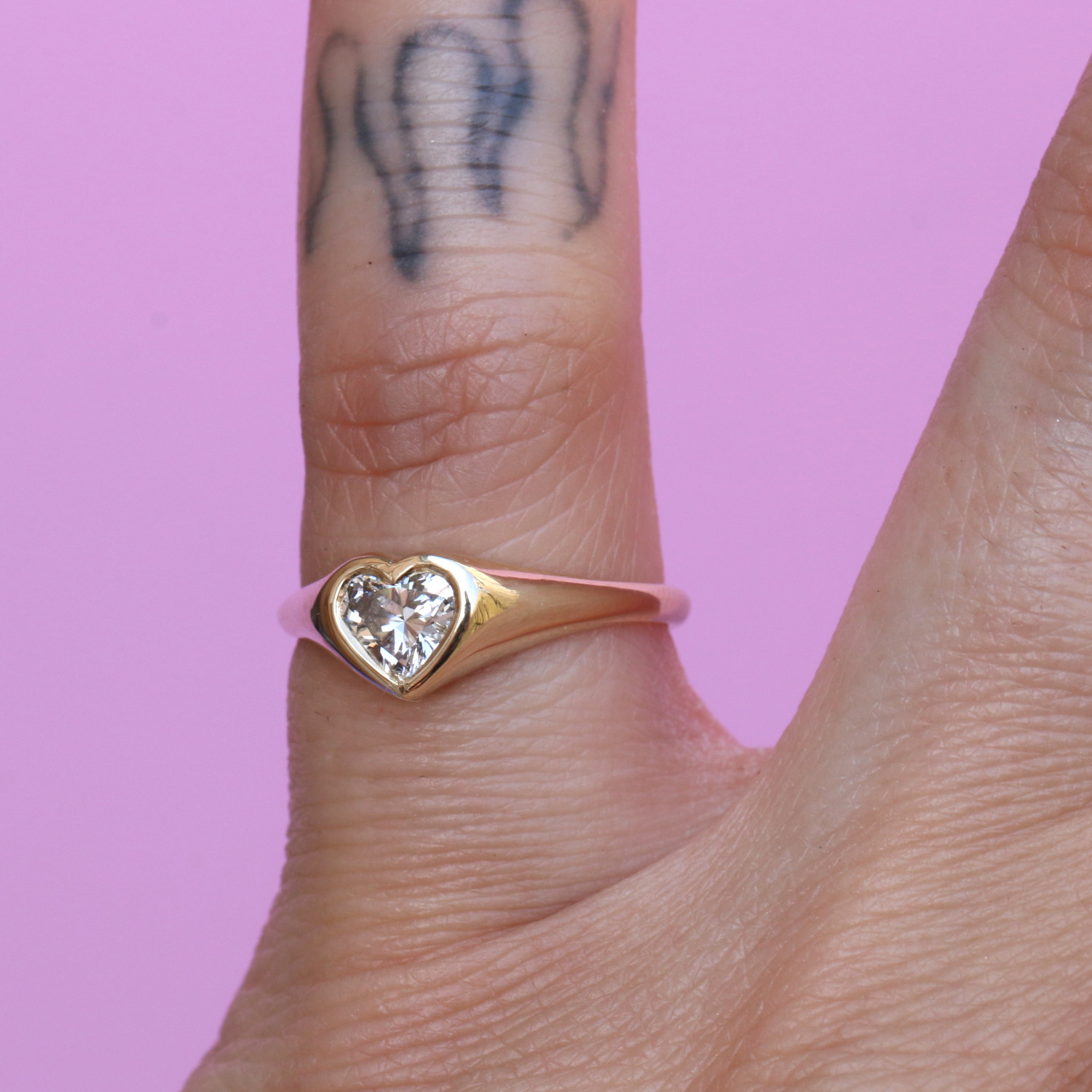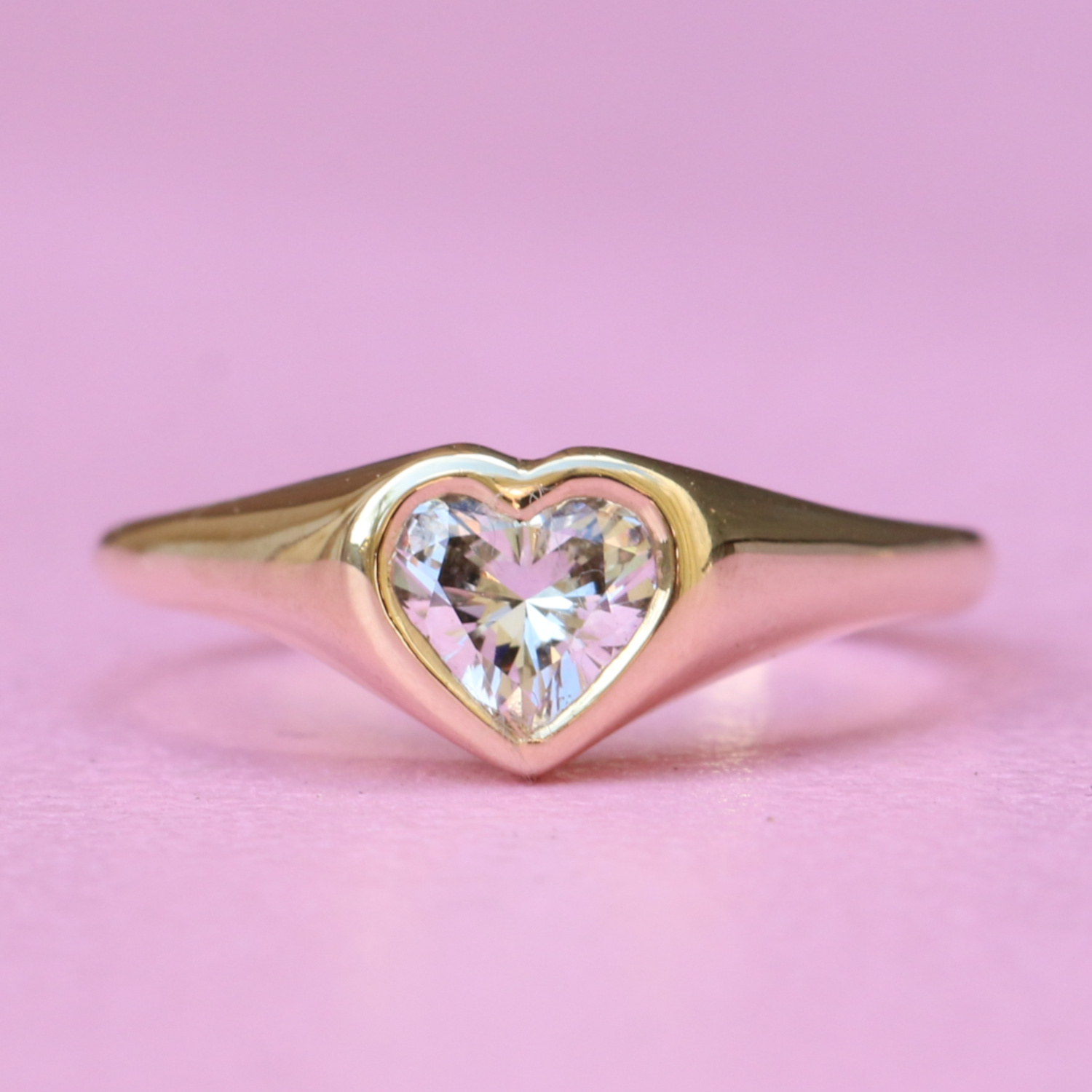 The Diamond Heart Signet Ring is a cute classic. Available in 9ct or 18ct yellow gold with a 0.4ct (5mm), colour D, clarity VS1, lab grown diamond. The diamond is IGI certified and you’ll receive the certificate with your ring. Get in touch to customise your stone selection or if you’d like this gorge ring made in a different metal.
