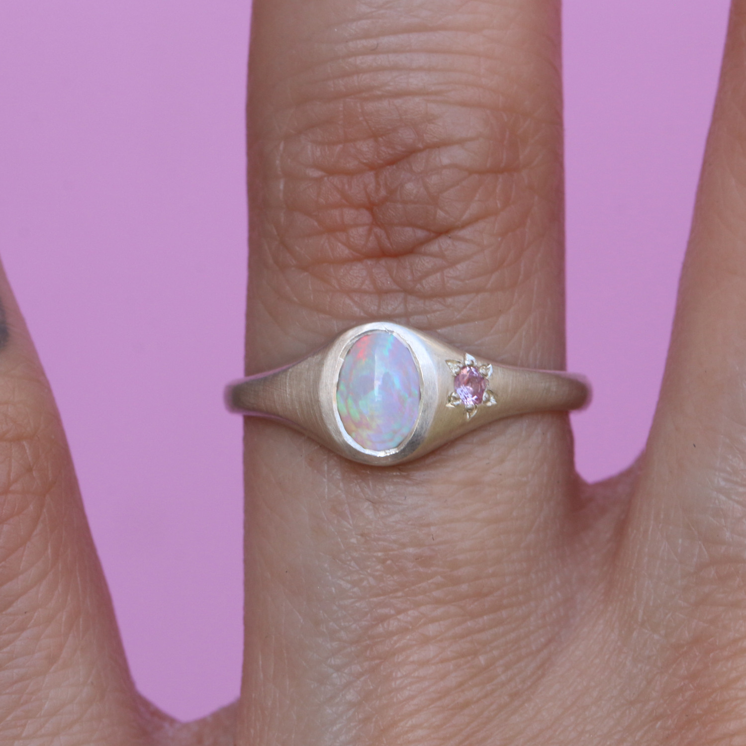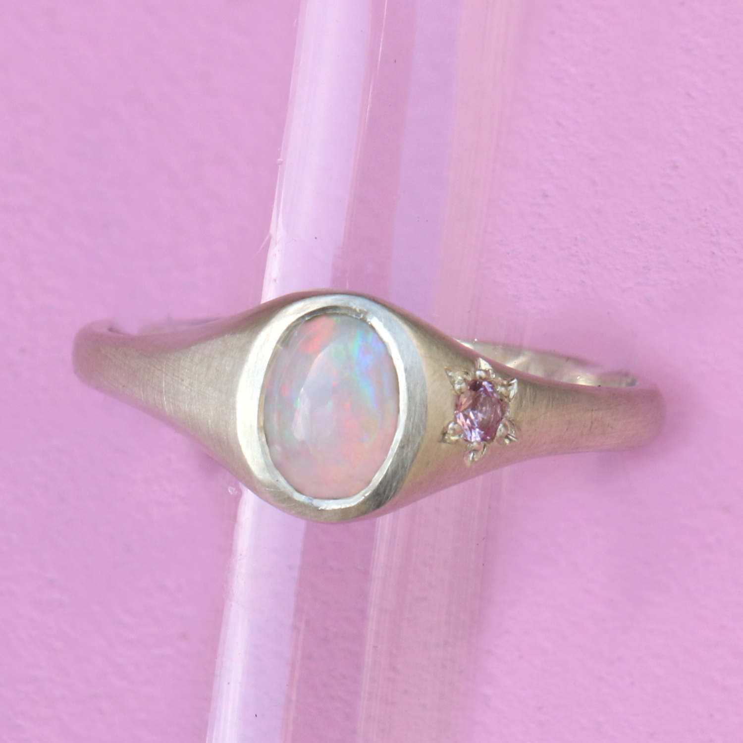 The Opal Signet Ring features a 5mm x 3mm Australian opal from Coober Pedy and a 2mm pink sapphire. Handmade with sterling silver, this ring is a size N and is ready to ship!